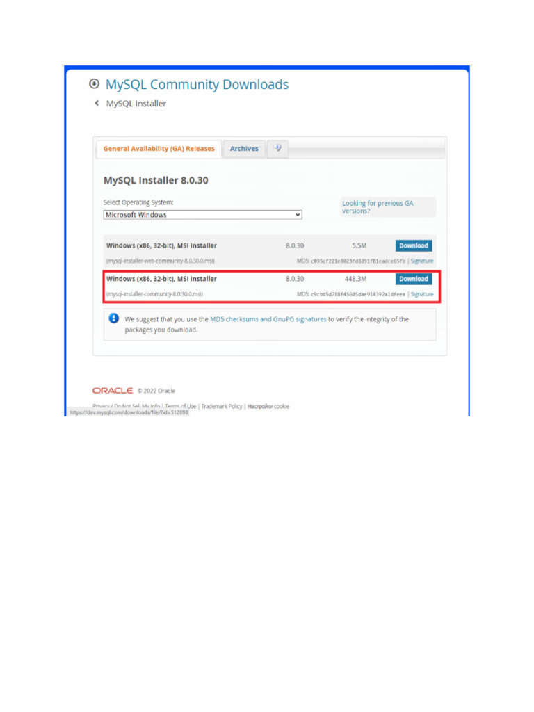 © MySQL Community Downloads < MySQL installer vailablity (GA) Releases | Archives | MySQL Installer 8.0.30 ‘Selet Operating syste: Looking for previous GA (Microsoft windows ‘windows (x86, 32-bit), MSI installer 8020 © we suggest tat you use te MOS cnecisums and GnuPG signatures to ery the tg ofthe phages you dowioad ORACLE 6207 0rae Pas! ie al ai Tams Use | Haden Ply | Harn cole© MySQL Community Downloads Login Now or Sign Up for a free account. ‘An Oracle Web Account provides you with the following advantages: + Fast access to MySQL software downloads + Download technical White Papers and Presentations + Post messages in the MySQl. Discussion Forums «Report and track bugs nthe MySQU bug system ee rae [Link] Is using Oracle SSO for authentication. if you already have an Oracle Web ‘account, click the Login link. Otherwise, you can signup for a free account by licking the Sign Up link and following the instructions. ks, just start my down ORACLE ©2022 0racle Pray Do Not sll My nf | Terms of Use| Trademark Plc | Harper cookieMySQL. Installer Choosing a Setup Type _— rene select the Setup Type tht suits your use cae © Developer Detat Seip ip dactn yet dectopmert pepo, incuing MySk Serve MySCL Shel MSL ete ys Wobeich MYSQL Comet, Utena Some mpd O Server ony ‘mucho.