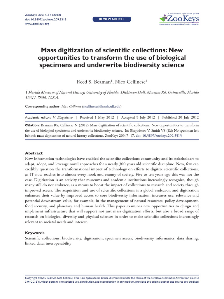 Citation: Beaman RS, Cellinese N (2012) Mass digitization of scientific collections: New opportunities to transform