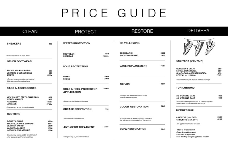 dry-cleaning -Recommended for sneakers -Charges vary as per the material, the size of