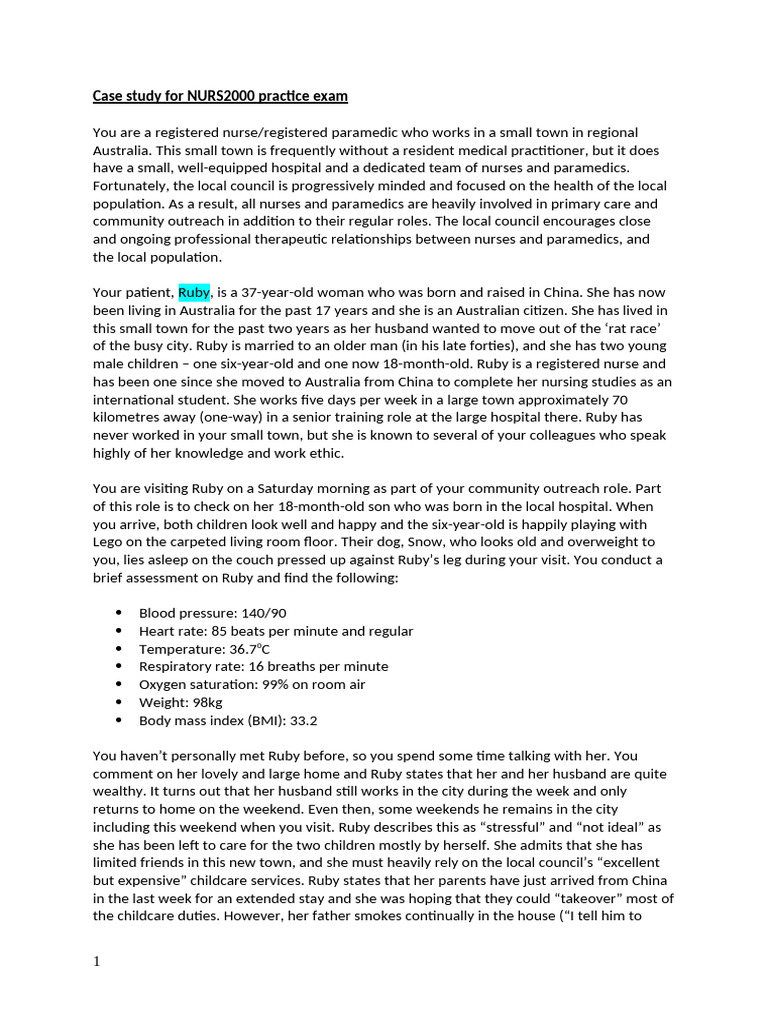 Case study for NURS2000 practice exam