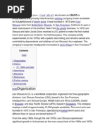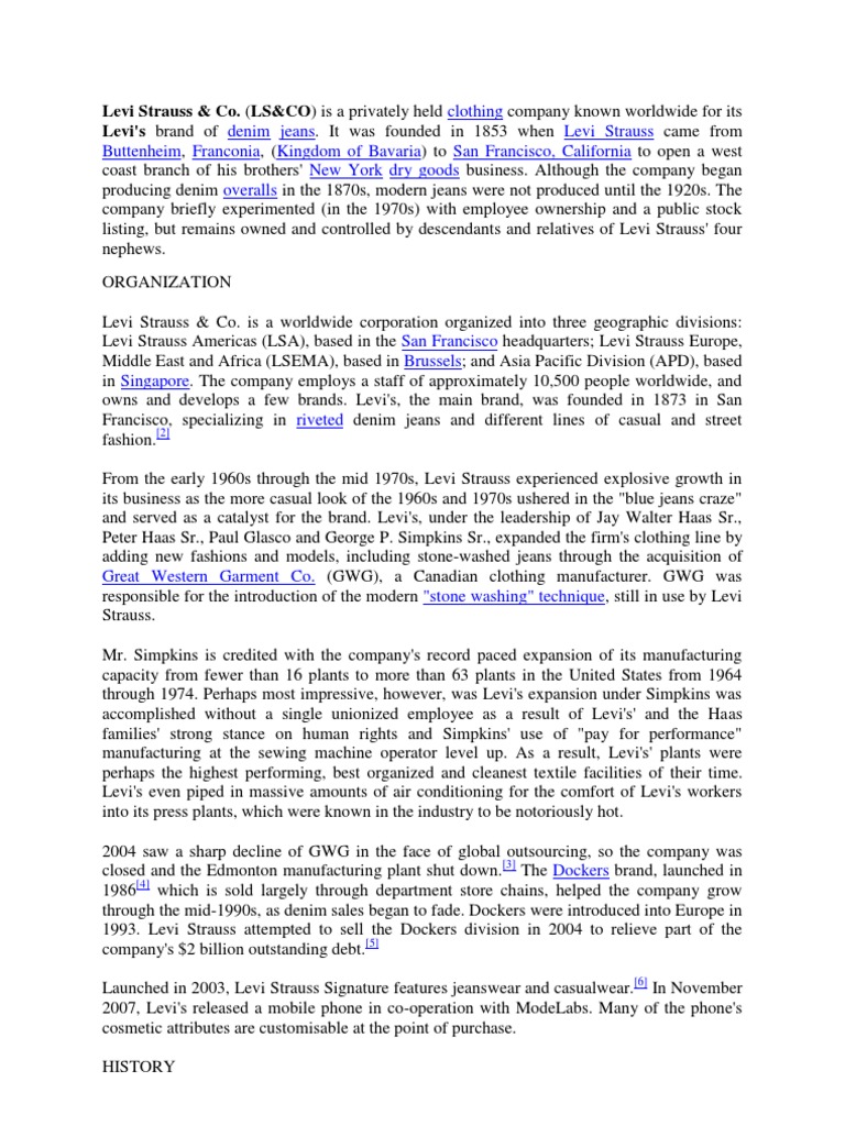 (LS&CO) is a privately held clothing company known worldwide for its Levi's brand of denim jeans. It was founded in 1853 when Levi Strauss came from Buttenheim, Franconia, (Kingdom of Bavaria) to San Francisco, California to open a west coast branch of his brothers' New York dry goods business. Although the company began producing denim overalls in the 1870s, modern jeans were not produced until the 1920s. The company briefly experimented (in the 1970s) with employee ownership and a public stock listing, but remains owned and controlled by descendants and relatives of Levi Strauss' four nephews. ORGANIZATION Levi Strauss & Co. is a worldwide corporation organized into three geographic divisions: Levi Strauss Americas (LSA), based in the San Francisco headquarters; Levi Strauss Europe, Middle East and Africa (LSEMA), based in Brussels; and Asia Pacific Division (APD), based in Singapore. The company employs a staff of approximately 10,500 people worldwide, and owns and develops a few brands. Levi's, the main brand, was founded in 1873 in San Francisco, specializing in riveted denim jeans and different lines of casual and street fashion.[2] From the early 1960s through the mid 1970s, Levi Strauss experienced explosive growth in its business as the more casual look of the 1960s and 1970s ushered in the "blue jeans craze" and served as a catalyst for the brand. Levi's, under the leadership of Jay Walter Haas Sr., Peter Haas Sr., Paul Glasco and George P. Simpkins Sr., expanded the firm's clothing line by adding new fashions and models, including stone-washed jeans through the acquisition of Great Western Garment Co. (GWG), a Canadian clothing manufacturer. GWG was responsible for the introduction of the modern "stone washing" technique, still in use by Levi Strauss. Mr. Simpkins is credited with the company's record paced expansion of its manufacturing capacity from fewer than 16 plants to more than 63 plants in the United States from 1964 through 1974. Perhaps most impressive, however, was Levi's expansion under Simpkins was accomplished without a single unionized employee as a result of Levi's' and the Haas families' strong stance on human rights and Simpkins' use of "pay for performance" manufacturing at the sewing machine operator level up. As a result, Levi's' plants were perhaps the highest performing, best organized and cleanest textile facilities of their time. Levi's even piped in massive amounts of air conditioning for the comfort of Levi's workers into its press plants, which were known in the industry to be notoriously hot. 2004 saw a sharp decline of GWG in the face of global outsourcing, so the company was closed and the Edmonton manufacturing plant shut down.[3] The Dockers brand, launched in 1986[4] which is sold largely through department store chains, helped the company grow through the mid-1990s, as denim sales began to fade. Dockers were introduced into Europe in 1993. Levi Strauss attempted to sell the Dockers division in 2004 to relieve part of the company's $2 billion outstanding debt.[5] Launched in 2003, Levi Strauss Signature features jeanswear and casualwear.[6] In November 2007, Levi's released a mobile phone in co-operation with ModeLabs. Many of the phone's cosmetic attributes are customisable at the point of purchase. HISTORY