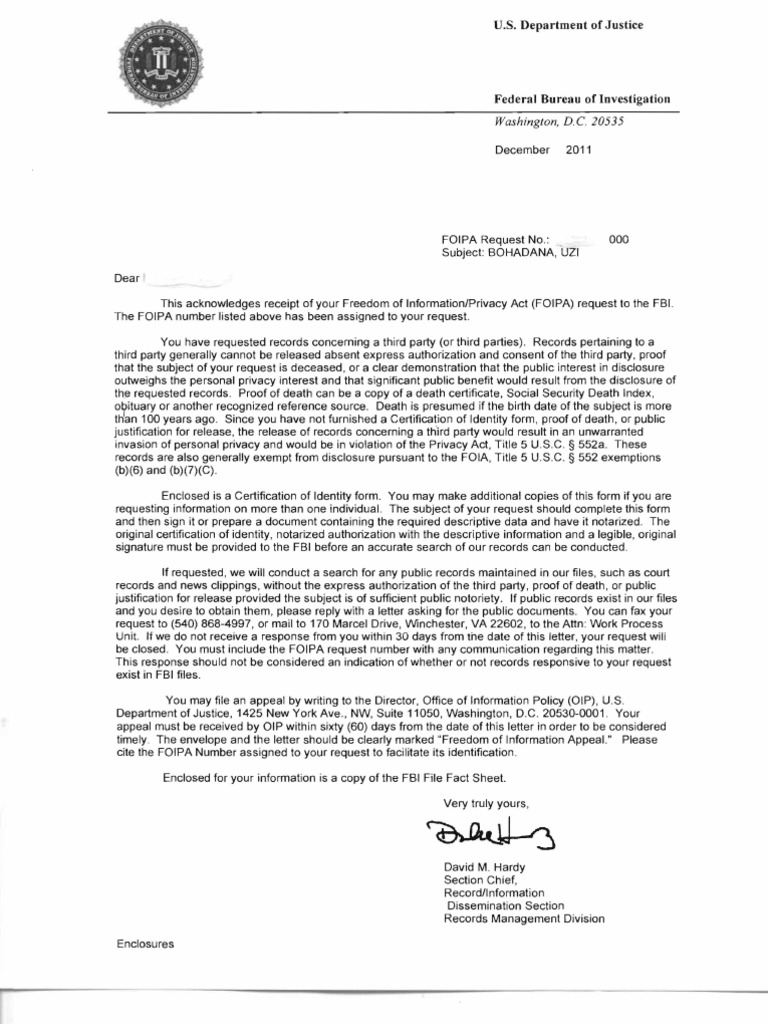 This acknowledges receipt of your Freedom of Information/Privacy Act (FOIPA) request to the FBI. The FOIPA number listed above has been assigned to your request. You have requested records concerning a third party (or third parties) . Records pertaining to a third party generally cannot be released absent express authorization and consent of the third party, proof that the subject of your request is deceased, or a clear demonstration that the public interest in disclosure outweighs the personal privacy interest and that significant public benefit would result from the disclosure of th.e requested records. Proof of death can be a copy of a death certificate, Social Security Death Index, ot;>ituary or another recognized reference source. Death is presumed if the birth date of the subject is more th'an 100 years ago. Since you have not furnished a Certification of Identity form, proof of death, or public justification for release , the release of records concerning a th-ird party would result in an unwarranted invasion of personal privacy and would be in violation of the Privacy Act , Title 5 U.S.C. 552a . These records are also generally exempt from disclosure pursuant to the FOIA, Title 5 U.S.C . 552 exemptions (b)(6) and (b)(7)(C) . Enclosed is a Certification of Identity form . You may make additional copies of this form if you are requesting information on more than one individual. The subject of your request should complete this form and then sign it or prepare a document containing the required descriptive data and have it notarized. The original certification of identity, notarized authorization with the descriptive information and a legible, original signature must be provided to the FBI before an accurate search of our records can be conducted . If requested, we will conduct a search for any public records maintained in our files, such as court records and news clippings, without the express authorization of the third party, proof of death, or public justification for release provided the subject is of sufficient public notoriety. If public records exist in our files and you desire to obtain them, please reply with a letter asking for the public documents. You can fax your request to (540) 868-4997, or mail to 170 Marcel Drive, Winchester, VA 22602, to the Attn : Work Process Unit. If we do not receive a response from you within 30 days from tile date of this letter, your request wili be closed . You must include the FOIPA request number with any communication regarding this matter. This response should not be considered an indication of whether or not records responsive to your request exist in FBI files. You may file an appeal by writing to the Director, Office of Information Policy (OIP), U.S. Department of Justice, 1425 New York Ave., NW, Suite 11050, Washington, D.C. 20530-0001 . Your appeal must be received by OIP within sixty (60) days from the date of this letter in order to be considered timely. The envelope and the letter should be clearly marked "Freedom of Information Appeal." Please cite the FOIPA Number assigned to your request to facilitate its identification . Enclosed for your information is a copy of the FBI File Fact Sheet. Very truly yours,