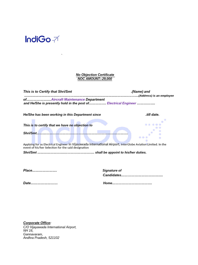 Applying for as Electrical Engineer in Vijayawada International Airport, InterGlobe Aviation Limited. In the