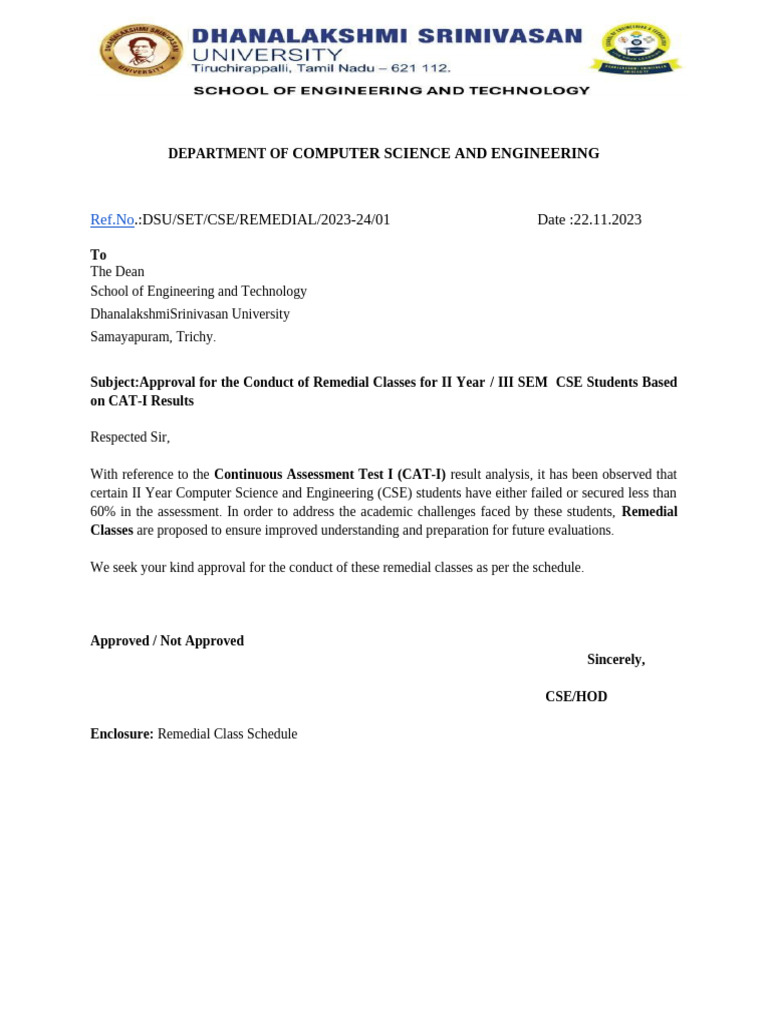 Subject:Approval for the Conduct of Remedial Classes for II Year / III SEM CSE Students Based