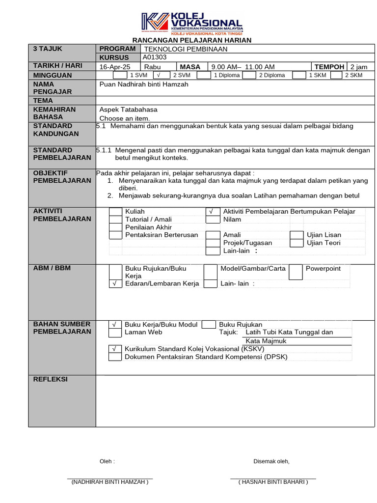 TARIKH / HARI 16-Apr-25 Rabu MASA 9.00 AM– 11.00 AM TEMPOH 2 jam