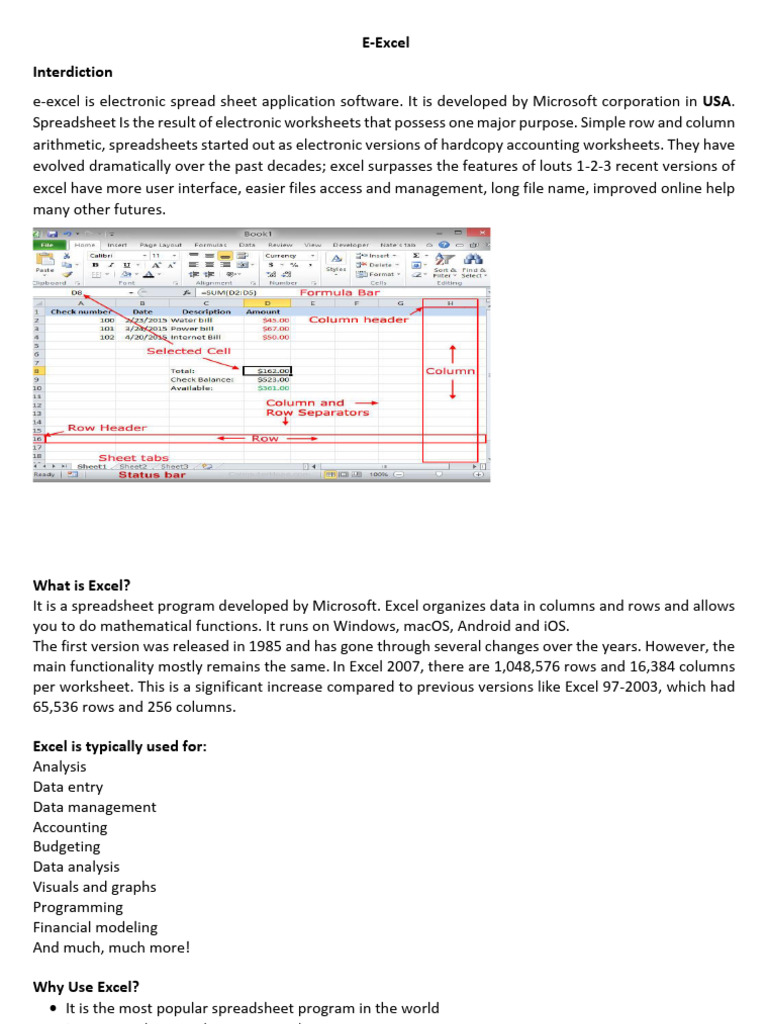 e-excel is electronic spread sheet application software. It is developed by Microsoft corporation in USA.