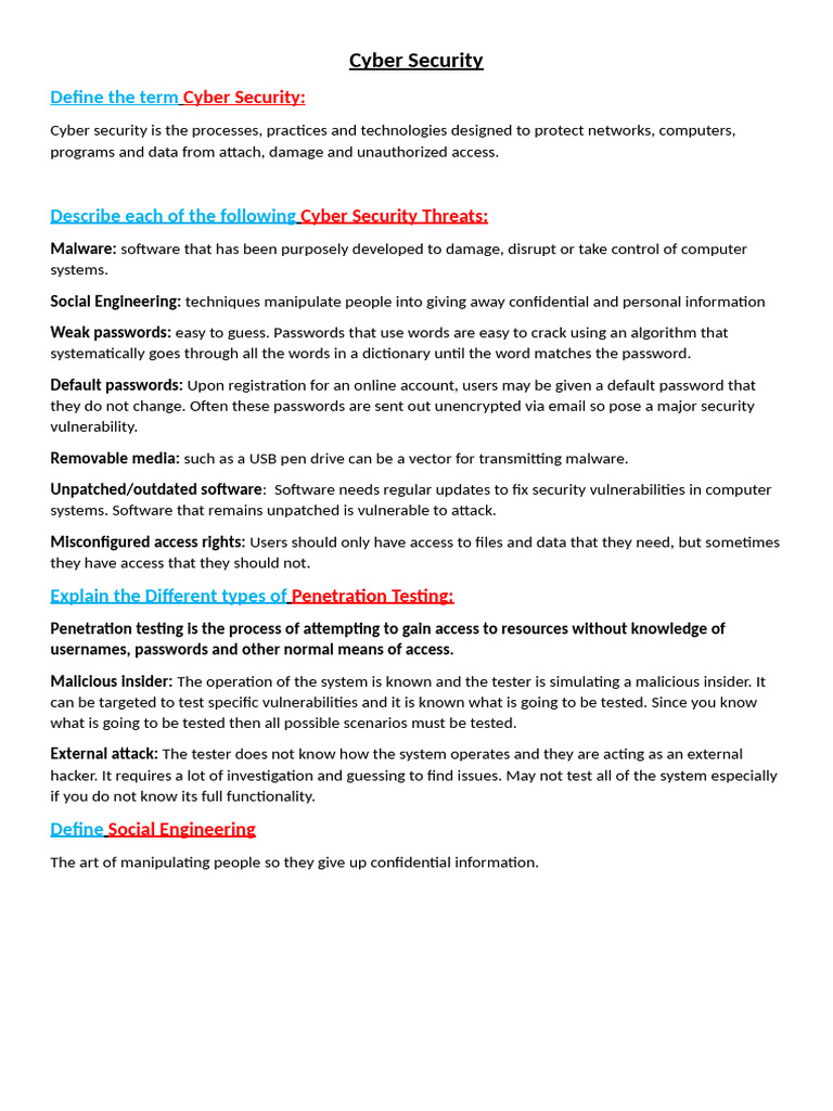 Describe each of the following Cyber Security Threats: