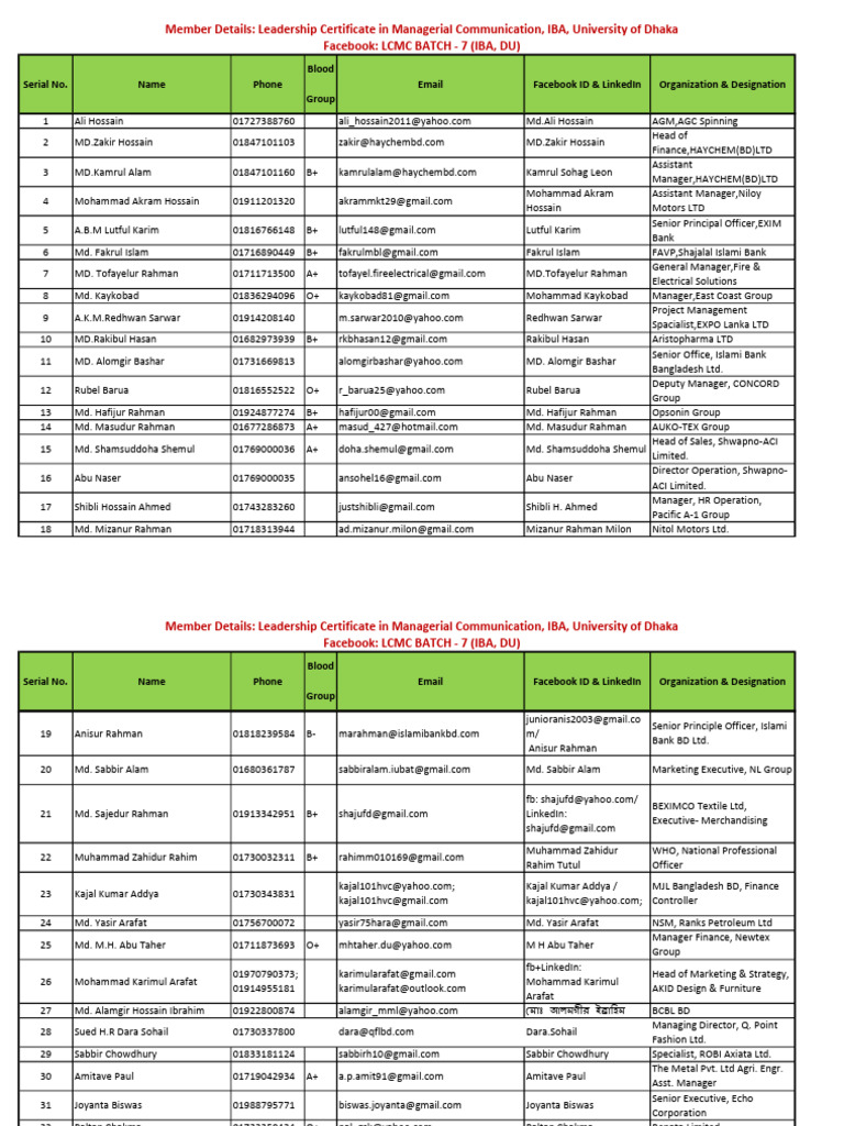 Serial No. Name Phone Email Facebook ID & LinkedIn Organization & Designation