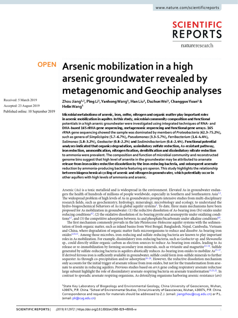 The widespread problem of high levels of As in groundwaters prompts intensive studies from multi-disciplinary