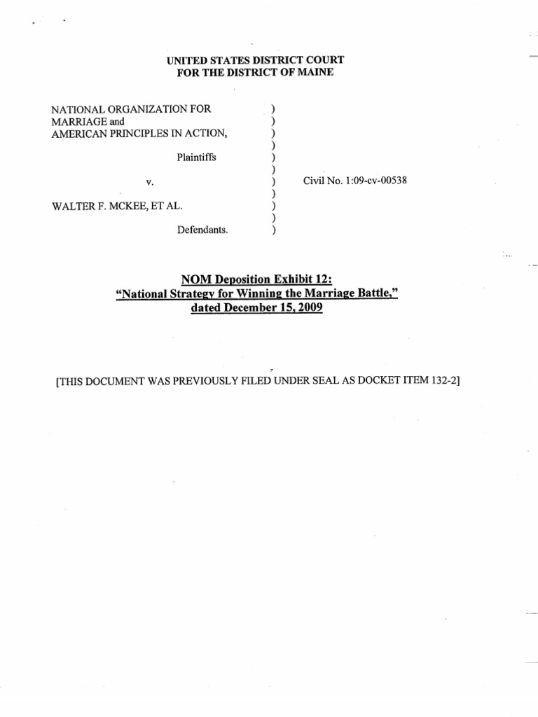 NATIONAL Organization for Marriage and AMERICAN PRINCIPLES in ACTION, Plaintiffs v. WALTERF. MCKEE,ET AL. Defendants. NOM Deposition Exhibit 12: "National Strategy for Winning the Marriage B…