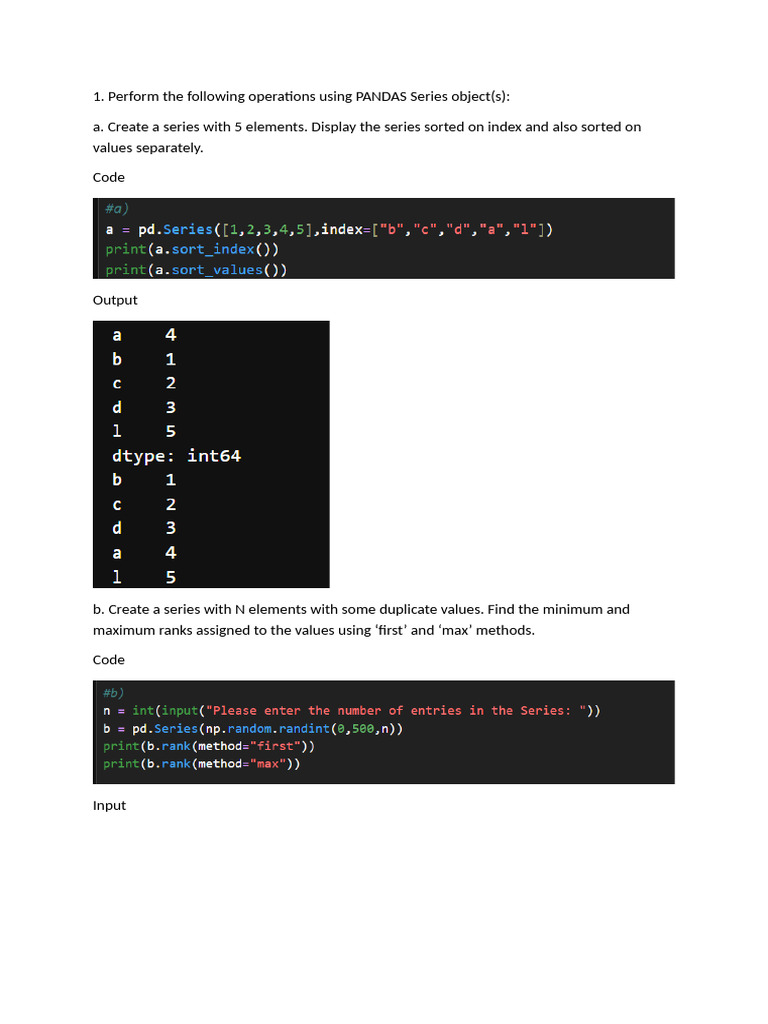 a. Create a series with 5 elements. Display the series sorted on index and also sorted on