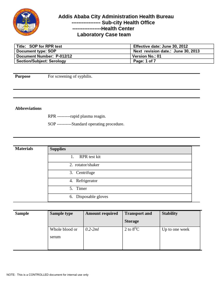 Title: SOP for RPR test Effective date: June 30, 2012