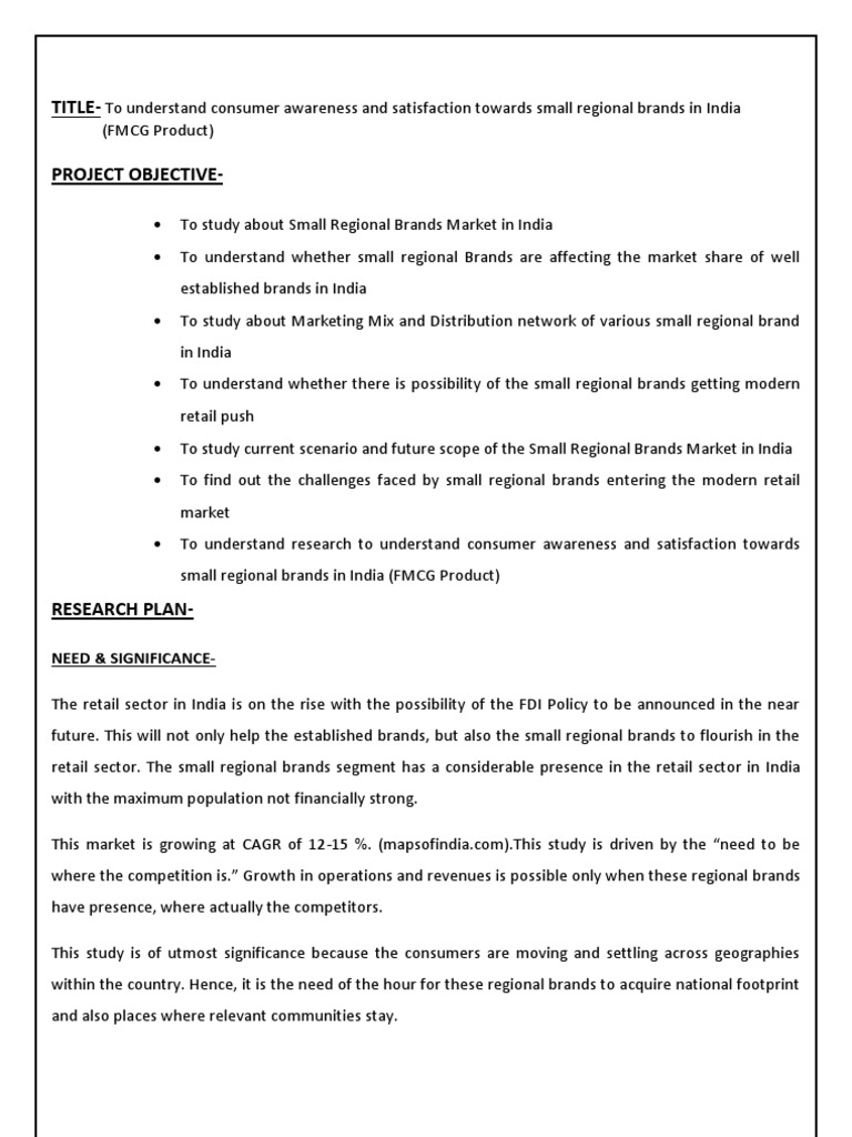 PROJECT OBJECTIVE To study about Small Regional Brands Market in India To understand whether small regional Brands are affecting the market share of well established brands in India To study about Marketing Mix and Distribution network of various small regional brand in India To understand whether there is possibility of the small regional brands getting modern retail push To study current scenario and future scope of the Small Regional Brands Market in India To find out the challenges faced by small regional brands entering the modern retail market To understand research to understand consumer awareness and satisfaction towards small regional brands in India (FMCG Product)