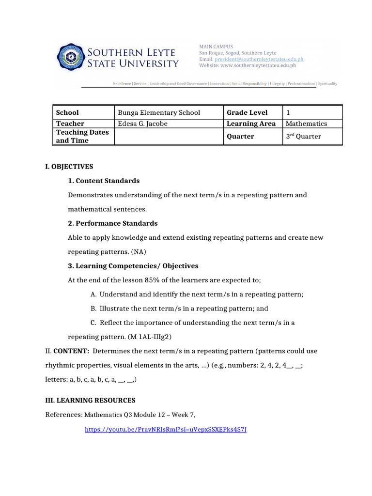 Teacher Edesa G. Jacobe Learning Area Mathematics