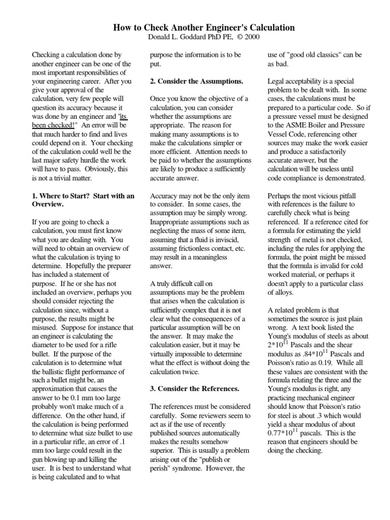 Donald L. Goddard PhD PE, 2000 Checking a calculation done by another engineer can be one of the most important responsibilities of your engineering career. After you give your approval of the calculation, very few people will question its accuracy because it was done by an engineer and "its been checked!" An error will be that much harder to find and lives could depend on it. Your checking of the calculation could well be the last major safety hurdle the work will have to pass. Obviously, this is not a trivial matter. 1. Where to Start? Start with an Overview. If you are going to check a calculation, you must first know what you are dealing with. You will need to obtain an overview of what the calculation is trying to determine. Hopefully the preparer has included a statement of purpose. If he or she has not included an overview, perhaps you should consider rejecting the calculation since, without a purpose, the results might be misused. Suppose for instance that an engineer is calculating the diameter to be used for a rifle bullet. If the purpose of the calculation is to determine what the ballistic flight performance of such a bullet might be, an approximation that causes the answer to be 0.1 mm too large probably won't make much of a difference. On the other hand, if the calculation is being performed to determine what size bullet to use in a particular rifle, an error of .1 mm too large could result in the gun blowing up and killing the user. It is best to understand what is being calculated and to what purpose the information is to be put. 2. Consider the Assumptions. Once you know the objective of a calculation, you can consider whether the assumptions are appropriate. The reason for making many assumptions is to make the calculations simpler or more efficient. Attention needs to be paid to whether the assumptions are likely to produce a sufficiently accurate answer. Accuracy may not be the only item to consider. In some cases, the assumption may be simply wrong. Inappropriate assumptions such as neglecting the mass of some item, assuming that a fluid is inviscid, assuming frictionless contact, etc. may result in a meaningless answer. A truly difficult call on assumptions may be the problem that arises when the calculation is sufficiently complex that it is not clear what the consequences of a particular assumption will be on the answer. It may make the calculation easier, but it may be virtually impossible to determine what the effect is without doing the calculation twice. 3. Consider the References. The references must be considered carefully. Some reviewers seem to act as if the use of recently published sources automatically makes the results somehow superior. This is usually a problem arising out of the "publish or perish" syndrome. However, the use of "good old classics" can be as bad. Legal acceptability is a special problem to be dealt with. In some cases, the calculations must be prepared to a particular code. So if a pressure vessel must be designed to the ASME Boiler and Pressure Vessel Code, referencing other sources may make the work easier and produce a satisfactorily accurate answer, but the calculation will be useless until code compliance is demonstrated. Perhaps the most vicious pitfall with references is the failure to carefully check what is being referenced. If a reference cited for a formula for estimating the yield strength of metal is not checked, including the rules for applying the formula, the point might be missed that the formula is invalid for cold worked material, or perhaps it doesn't apply to a particular class of alloys. A related problem is that sometimes the source is just plain wrong. A text book listed the Young's modulus of steels as about 2*1011 Pascals and the shear modulus as .84*1011 Pascals and Poisson's ratio as 0.19. While all these values are consistent with the formula relating the three and the Young's modulus is right, any practicing mechanical engineer should know that Poisson's ratio for steel is about .3 which would yield a shear modulus of about 0.77*1011 pascals. This is the reason that engineers should be doing the checking.