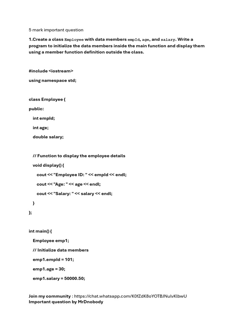 1.Create a class Employee with data members empId, age, and salary. Write a