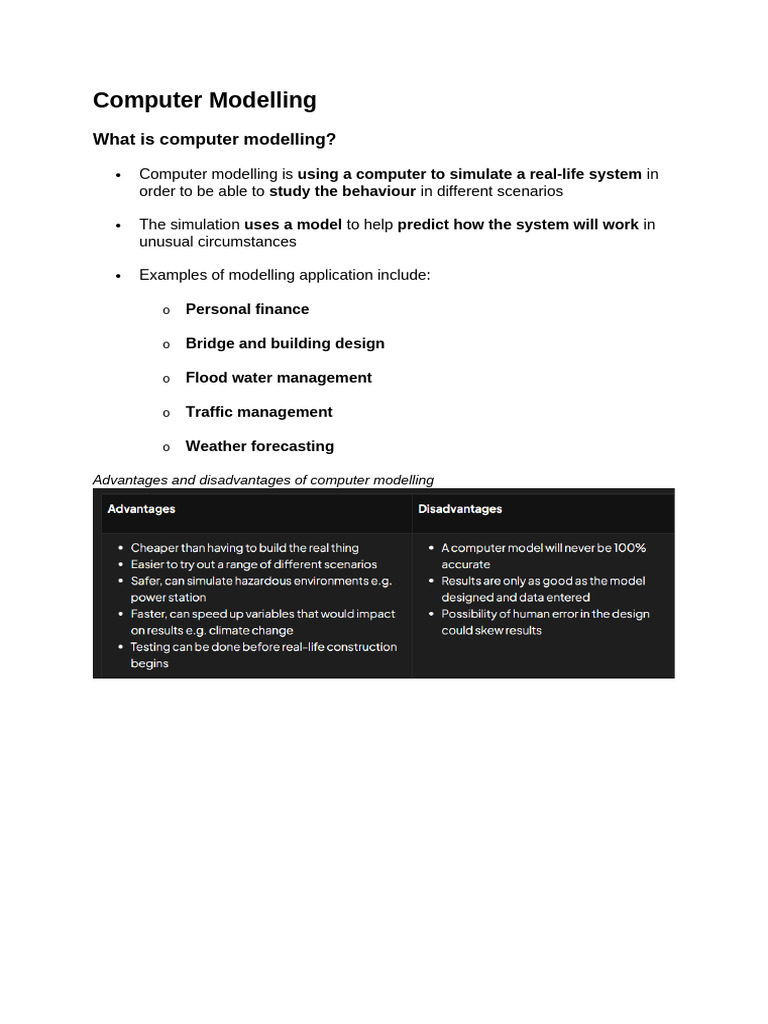 Advantages and disadvantages of computer modelling