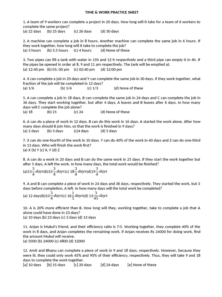 1. A team of 9 workers can complete a project in 20 days. How long will it take for a team of 6 workers to