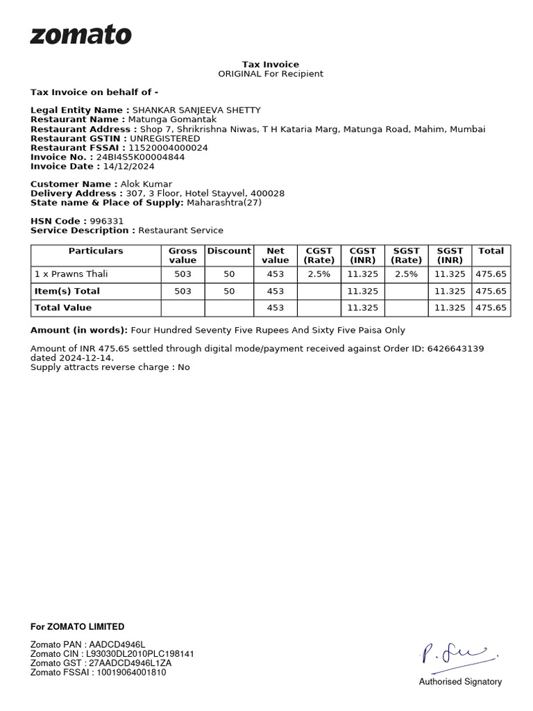1 x Prawns Thali 503 50 453 2.5% 11.325 2.5% 11.325 475.65