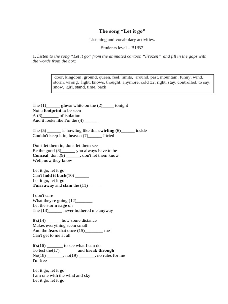 1. Listen to the song “Let it go” from the animated cartoon “Frozen” and fill in the gaps with