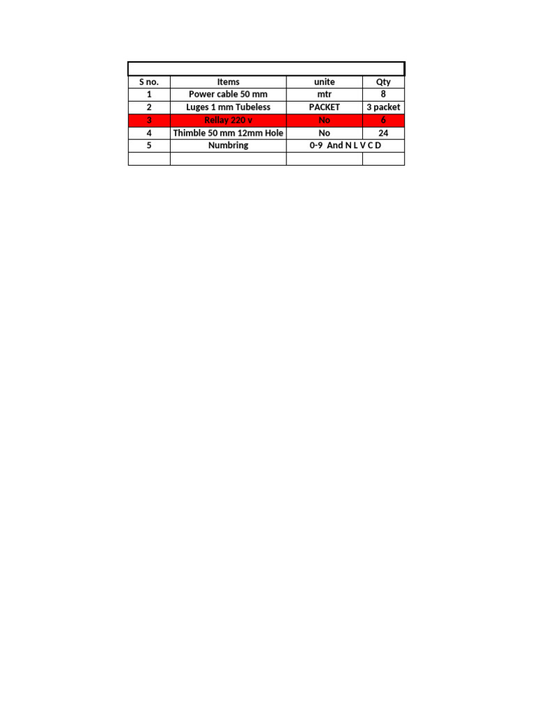 The document is a list of items with their respective quantities and units. It includes power cables, luges, relays, thimbles, and numbering items. The quantities range from 3 packets to 24 units for various items.