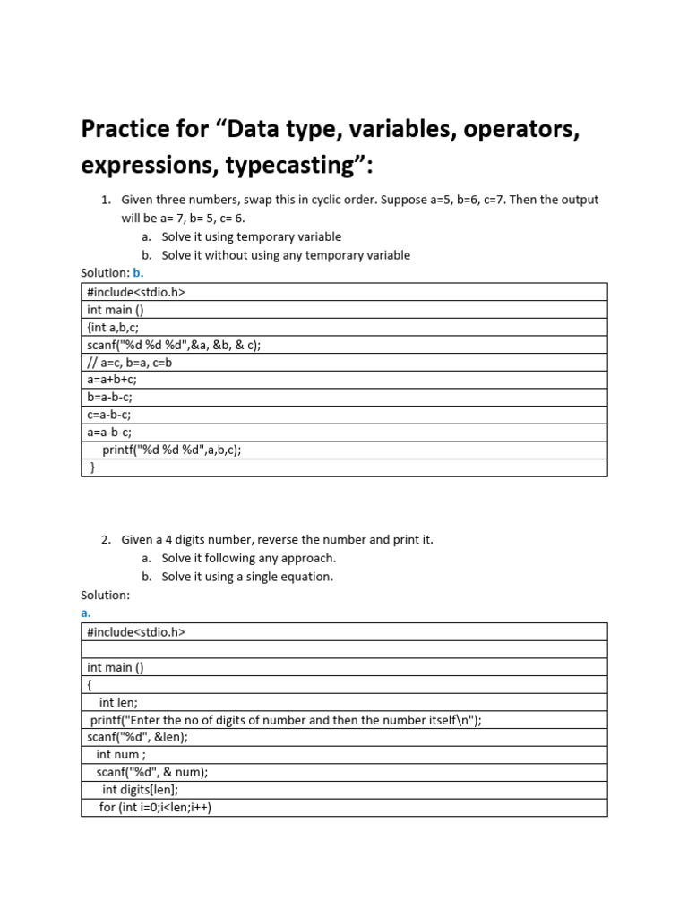 1. Given three numbers, swap this in cyclic order. Suppose a=5, b=6, c=7. Then the output