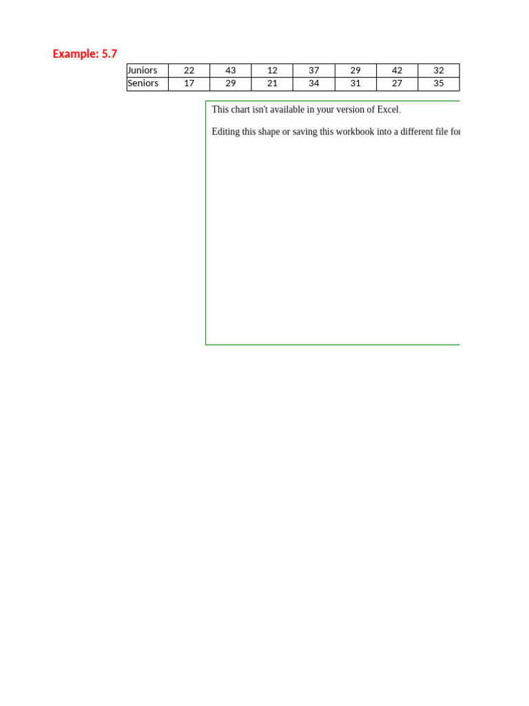 The document contains a chart comparing data for Juniors and Seniors across various categories. It notes that the chart is not available in the current version of Excel being used. Additionally, it warns that editing the shape or saving the workbook in a different format will permanently break the chart.