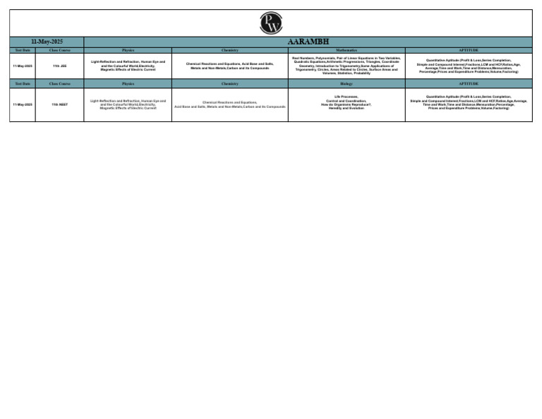 11-May-2025 11th NEET and the Colourful World,Electricity, How do Organisms Reproduce?, Time and Work,Time and Distance,Mensuration,Percentage,