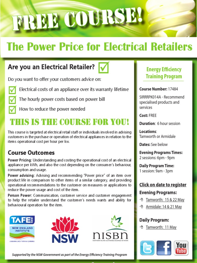 This course is targeted at electrical retail staff or individuals involved in advising customers in the purchase or operation of electrical appliances in relation to the items operational cost per hour per kw.