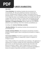 GREEN MARKETING Unfortunately, a majority of people believe that green marketing refers solely to the promotion or advertising of products with environmental characteristics. Terms like phosphate free, Recyclable, Ozone friendly, and Environmentally Friendly are some of the things consumers most often associate with green marketing. While these terms are green marketing claims, in general green marketing is much broader concept, one that can be applied to consumer goods, industrial goods and even services. For example, around the world there are resorts that are beginning to promote themselves as ecotourist facilities. Thus green marketing incorporates a broad range of activities, including product modification, changes to production process, packaging changes, as well as modifying