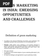 GREEN MARKETING IN INDIAN SCENARIO The term Green Marketing is relatively new in the Indian context. The most visible manifestations of corporate activities have been in industries associated with polluting the environment (Petroleum, fuel) or niche segments in some sectors such as hotels and stationery. Other than this, there is no significant drive to pursue options in the production of greener products or building up a consumer base for green products. Understandably so, given the absence of regulations in place to steer firms towards greener alternatives, leave alone design of green manufacturing systems, even the existing rules on effluent treatment and gaseous emissions into the atmosphere are not implemented properly. A trend that evolved two decades ago in developed markets has just started in India. Over the past few years, some sectors in India have seen green initiatives by firms. Partly to differentiate their offerings in a competitive milieu and partly to take advantage of the price premium possible, many companies have started offering branded products in several categories. Some of these are detailed below a) Renewable Energy Setting up of Indian Renewable Energy Development Agency Limited (IREDA) in 1987 was such an attempt. At the customer end, Tata BP solar provides many solar products for households under different brands. b) Hospitality ECOTEL is a global certification for eco friendly hotels. Presently there are 36 hotels worldwide of which 5 are in India. c) Fuel Public sector giants like BPCL, HPCL and Indian Oil became more market oriented with the liberalization of the sector. BPCL offers greener fuels under the brands Speed, Speed 93, Speed 97 and Hi-speed diesel. d) Automotive Bajaj Auto launched ECOrick, an electric three wheeler. Hyderabad based Cynosure Enterprises Limited launched Yash E Bike, an electric two wheeler that runs at a speed of 25 to 30 km/hr.