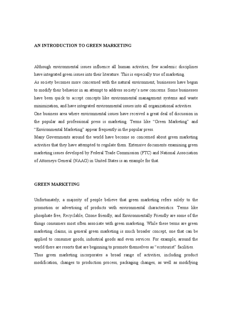 Although environmental issues influence all human activities, few academic disciplines have integrated green issues into their literature. This is especially true of marketing. As society becomes more concerned with the natural environment, businesses have begun to modify their behavior in an attempt to address societys new concerns. Some businesses have been quick to accept concepts like environmental management systems and waste minimization, and have integrated environmental issues into all organizational activities. One business area where environmental issues have received a great deal of discussion in the popular and professional press is marketing. Terms like Green Marketing and Environmental Marketing appear frequently in the popular press. Many Governments around the world have become so concerned about green marketing activities that they have attempted to regulate them. Extensive documents examining green marketing issues developed by Federal Trade Commission (FTC) and National Association of Attorneys General (NAAG) in United States is an example for that.