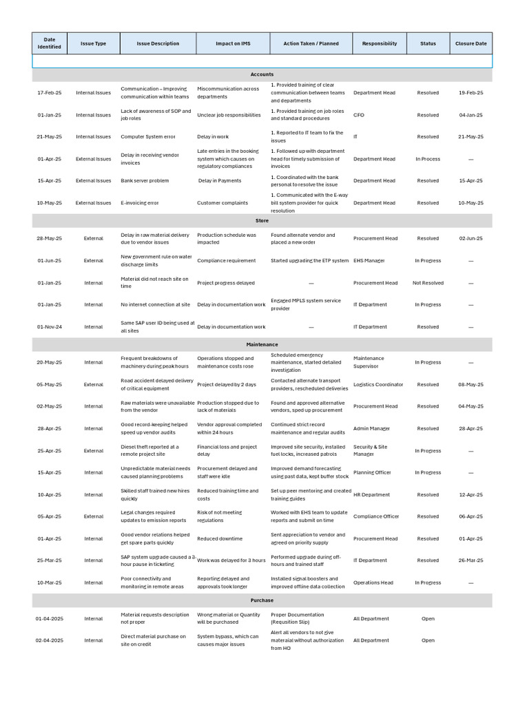 Issue Type Issue Description Impact on IMS Action Taken / Planned Responsibility Status Closure Date