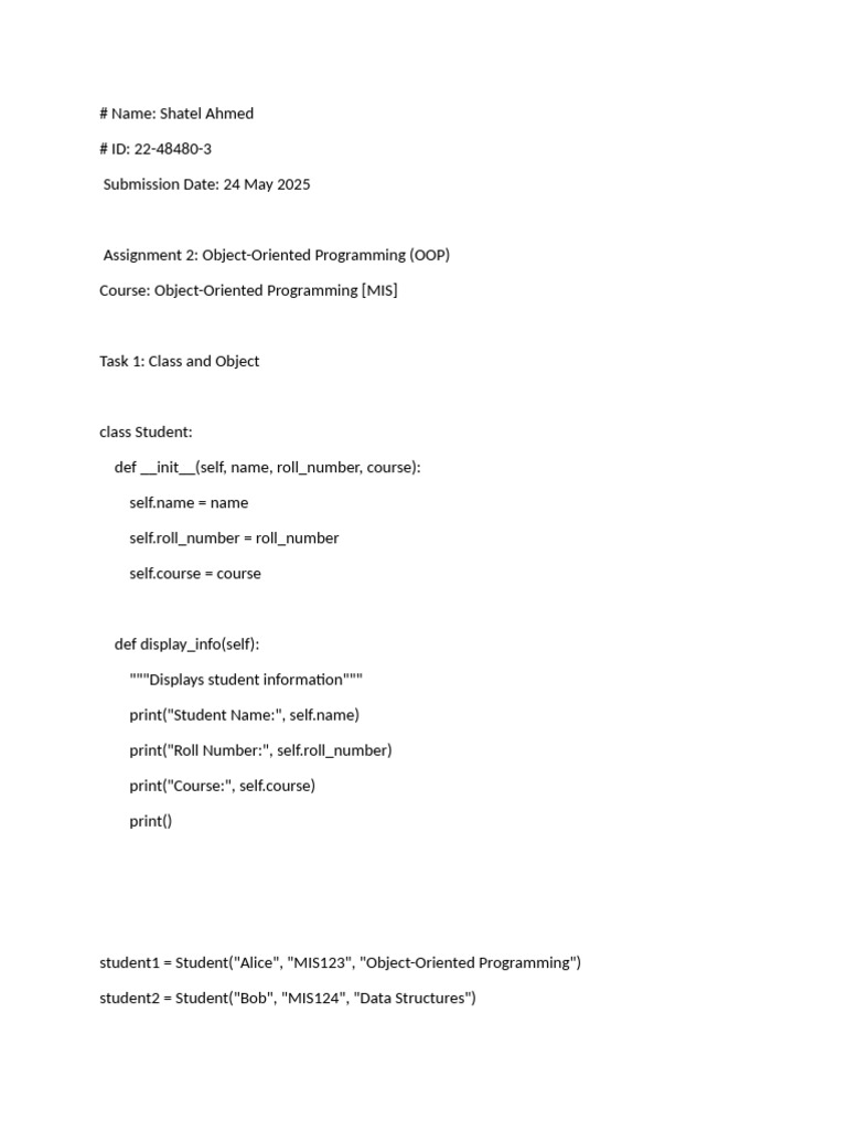 student1 = Student("Alice", "MIS123", "Object-Oriented Programming")