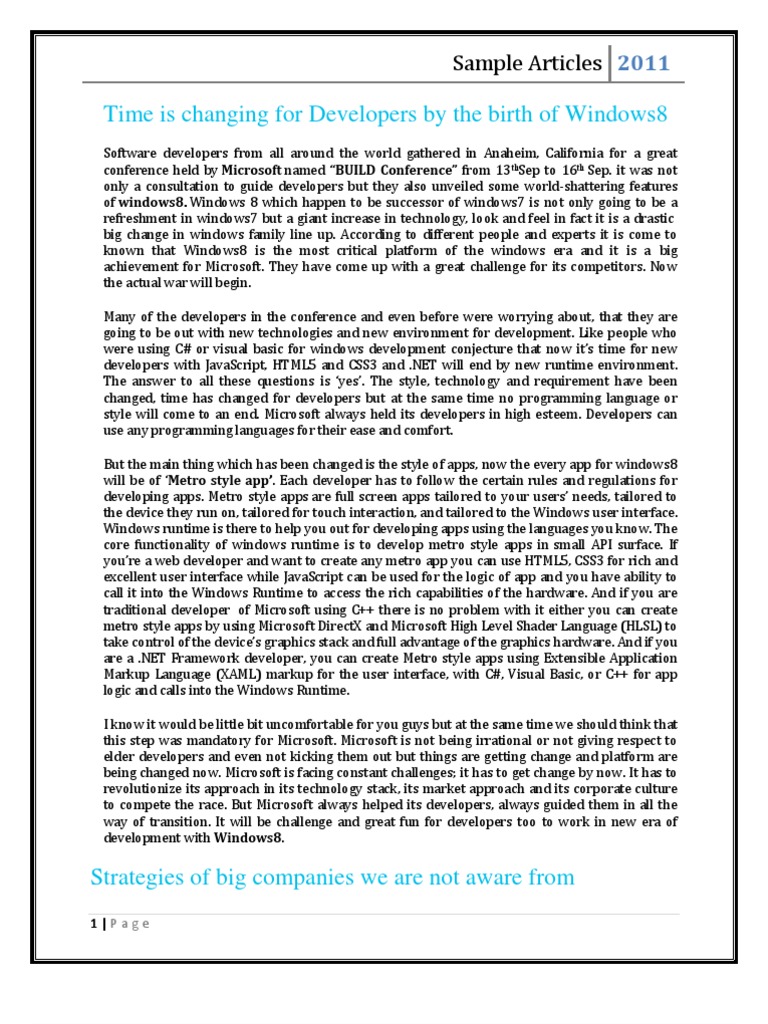 Software developers from all around the world gathered in Anaheim, California for a great conference held by Microsoft named BUILD Conference from 13thSep to 16th Sep. it was not only a consultation to guide developers but they also unveiled some world-shattering features of windows8. Windows 8 which happen to be successor of windows7 is not only going to be a refreshment in windows7 but a giant increase in technology, look and feel in fact it is a drastic big change in windows family line up. According to different people and experts it is come to known that Windows8 is the most critical platform of the windows era and it is a big achievement for Microsoft. They have come up with a great challenge for its competitors. Now the actual war will begin. Many of the developers in the conference and even before were worrying about, that they are going to be out with new technologies and new environment for development. Like people who were using C# or visual basic for windows development conjecture that now its time for new developers with JavaScript, HTML5 and CSS3 and .NET will end by new runtime environment. The answer to all these questions is yes. The style, technology and requirement have been changed, time has changed for developers but at the same time no programming language or style will come to an end. Microsoft always held its developers in high esteem. Developers can use any programming languages for their ease and comfort. But the main thing which has been changed is the style of apps, now the every app for windows8 will be of Metro style app. Each developer has to follow the certain rules and regulations for developing apps. Metro style apps are full screen apps tailored to your users needs, tailored to the device they run on, tailored for touch interaction, and tailored to the Windows user interface. Windows runtime is there to help you out for developing apps using the languages you know. The core functionality of windows runtime is to develop metro style apps in small API surface. If youre a web developer and want to create any metro app you can use HTML5, CSS3 for rich and excellent user interface while JavaScript can be used for the logic of app and you have ability to call it into the Windows Runtime to access the rich capabilities of the hardware. And if you are traditional developer of Microsoft using C++ there is no problem with it either you can create metro style apps by using Microsoft DirectX and Microsoft High Level Shader Language (HLSL) to take control of the devices graphics stack and full advantage of the graphics hardware. And if you are a .NET Framework developer, you can create Metro style apps using Extensible Application Markup Language (XAML) markup for the user interface, with C#, Visual Basic, or C++ for app logic and calls into the Windows Runtime. I know it would be little bit uncomfortable for you guys but at the same time we should think that this step was mandatory for Microsoft. Microsoft is not being irrational or not giving respect to elder developers and even not kicking them out but things are getting change and platform are being changed now. Microsoft is facing constant challenges; it has to get change by now. It has to revolutionize its approach in its technology stack, its market approach and its corporate culture to compete the race. But Microsoft always helped its developers, always guided them in all the way of transition. It will be challenge and great fun for developers too to work in new era of development with Windows8.
