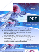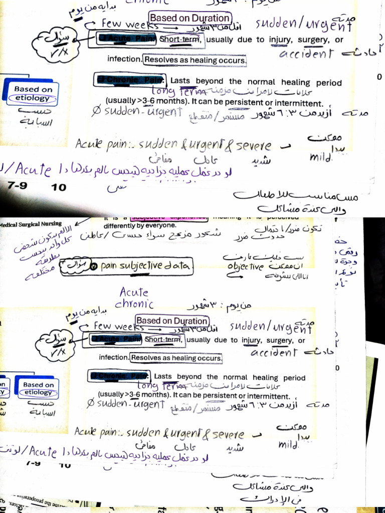 The document discusses various types of pain, including acute and chronic pain, their characteristics, and the pain assessment tools used to evaluate them. It also covers surgical procedures, the importance of informed consent, anesthesia types, and postoperative complications. Key points include the physiological processes of pain and the role of nursing management in both preoperative and postoperative care.