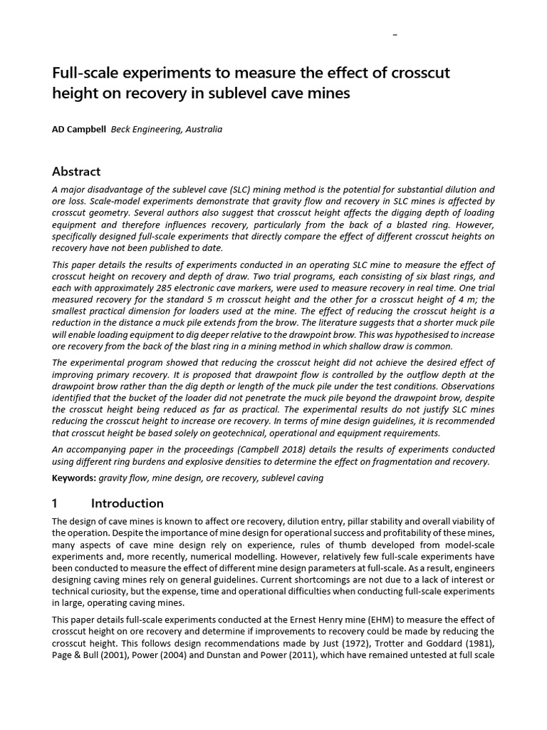 of crosscut height on ore recovery and gravity flow mechanics to date.
