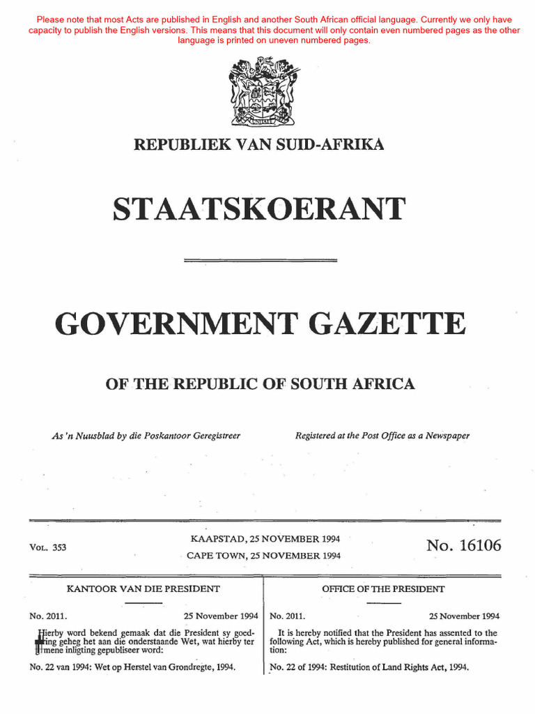 RESliTUTION OF LAND RIGHTS ACI", 1994 Act No. 22, 1994