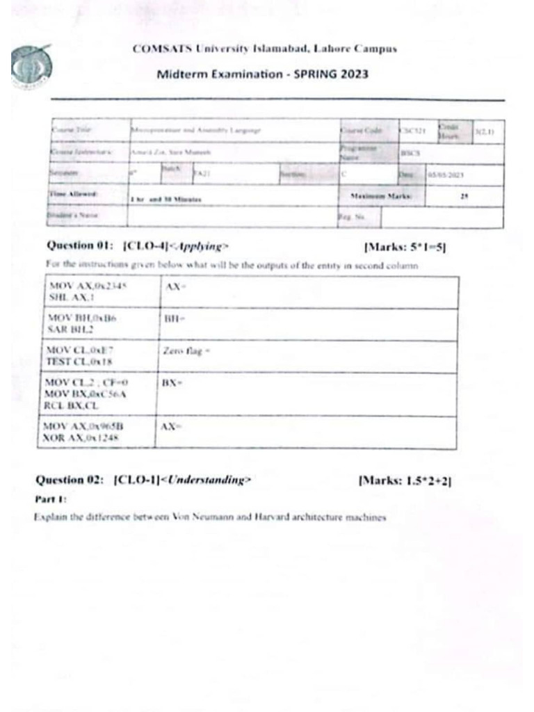FE. | XOR BX, 80h‘Question 3: Show the physical address of a memory location given by 30FFh:1A10h [CLO-2]___[Marks: 2]