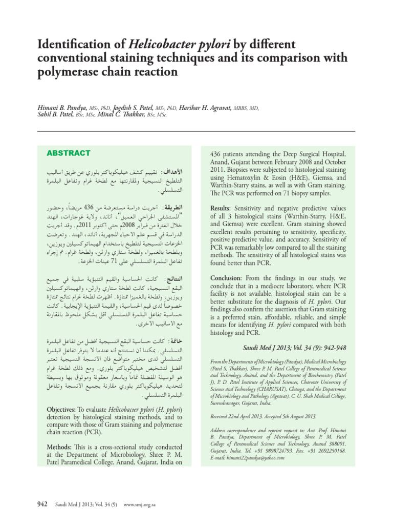 لتحديد هيليكوباكتر بلوري مقارنة بجميع األنسجة وتفاعل Science and Technology (CHARUSAT), Changa, and the Department