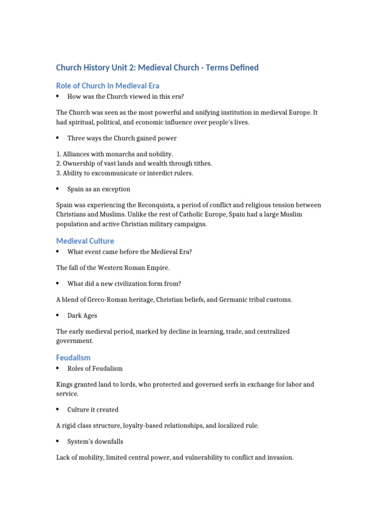 Church History Unit 2: Medieval Church - Terms Defined