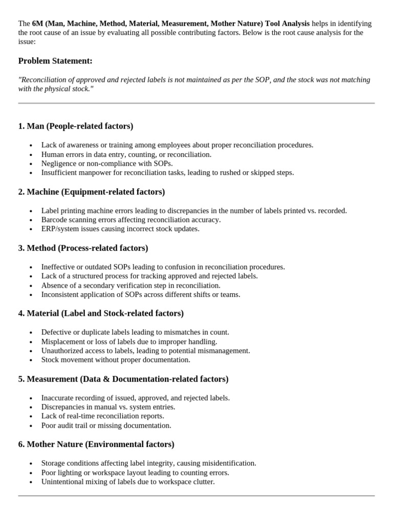 The 6M (Man, Machine, Method, Material, Measurement, Mother Nature) Tool Analysis helps in identifying
