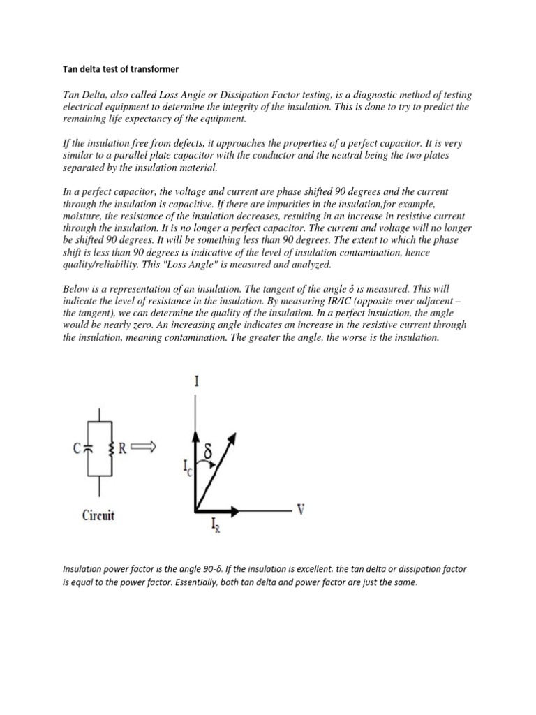 Tan Delta, also called Loss Angle or Dissipation Factor testing, is a diagnostic method of testing electrical equipment to determine the integrity of the insulation. This is done to try to predict the remaining life expectancy of the equipment. If the insulation free from defects, it approaches the properties of a perfect capacitor. It is very similar to a parallel plate capacitor with the conductor and the neutral being the two plates separated by the insulation material. In a perfect capacitor, the voltage and current are phase shifted 90 degrees and the current through the insulation is capacitive. If there are impurities in the insulation,for example, moisture, the resistance of the insulation decreases, resulting in an increase in resistive current through the insulation. It is no longer a perfect capacitor. The current and voltage will no longer be shifted 90 degrees. It will be something less than 90 degrees. The extent to which the phase shift is less than 90 degrees is indicative of the level of insulation contamination, hence quality/reliability. This "Loss Angle" is measured and analyzed. Below is a representation of an insulation. The tangent of the angle is measured. This will indicate the level of resistance in the insulation. By measuring IR/IC (opposite over adjacent the tangent), we can determine the quality of the insulation. In a perfect insulation, the angle would be nearly zero. An increasing angle indicates an increase in the resistive current through the insulation, meaning contamination. The greater the angle, the worse is the insulation.