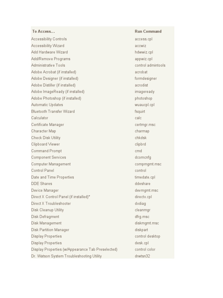 Run Command access.cpl accwiz hdwwiz.cpl appwiz.cpl control admintools acrobat formdesigner acrodist imageready photoshop wuaucpl.cpl fsquirt calc certmgr.msc charmap chkdsk clipbrd cmd dcomcnfg compmgmt.msc control timedate.cpl ddeshare devmgmt.msc directx.cpl dxdiag cleanmgr dfrg.msc diskmgmt.msc diskpart control desktop desk.cpl control color drwtsn32