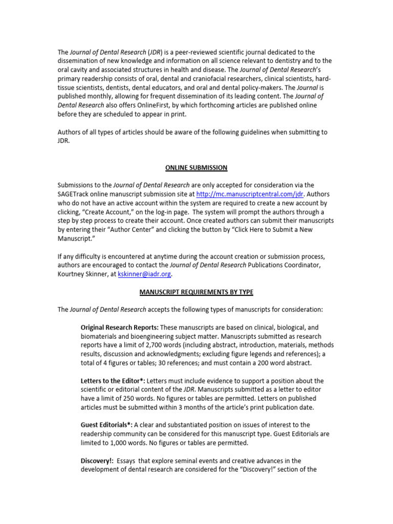 The Journal of Dental Research accepts the following types of manuscripts for consideration: