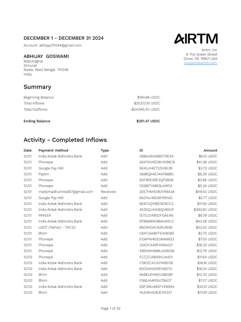 12/31 ranjitrk1991@yahoo.co.in Sent 1BB0NE4063RJB179 -$348.45 USDC