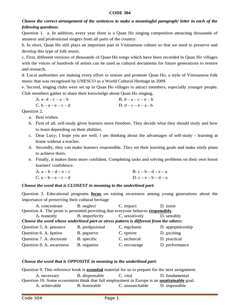 Question 5. A. entrance B. professional C. mechanic D. apprenticeship