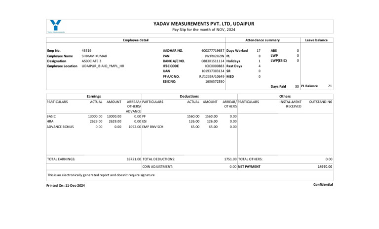 Pay Slip for the month of NOV, 2024
