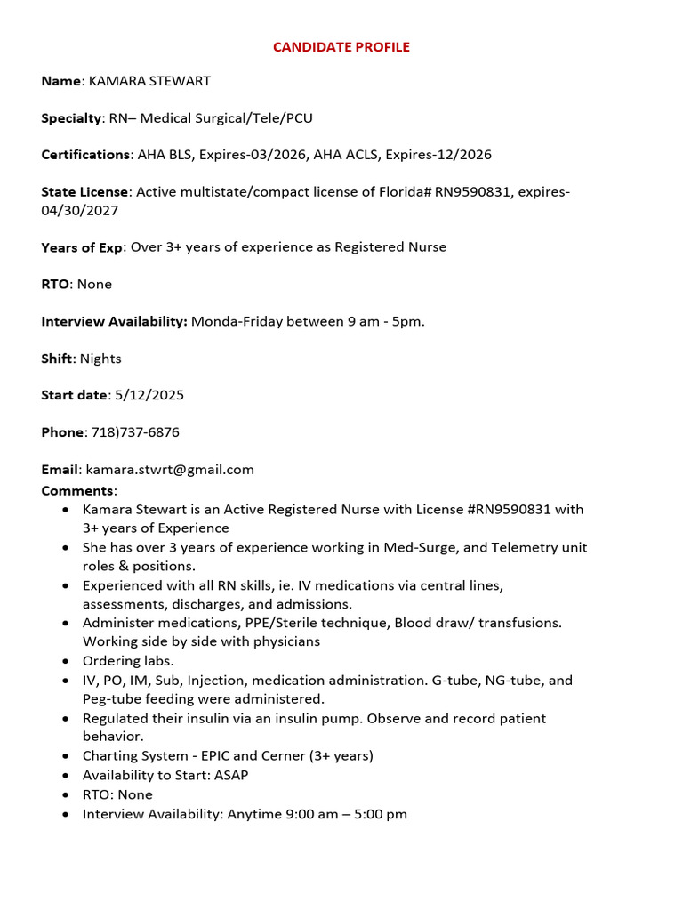 • Kamara Stewart is an Active Registered Nurse with License #RN9590831 with 3+ years of Experience