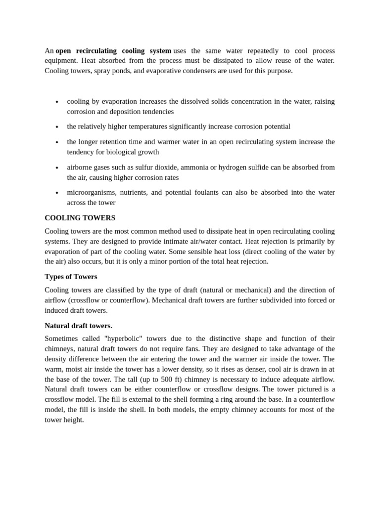 Cooling towers are the most common method used to dissipate heat in open recirculating cooling